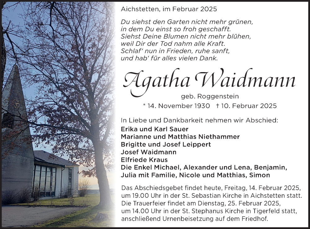 Hier finden Sie alle Traueranzeigen aus der Zeitung, die bisher für Agatha Waidmann erschienen sind. Weitere Traueranzeigen, die in der Zeitung erscheinen, werden hier ebenfalls aufgelistet