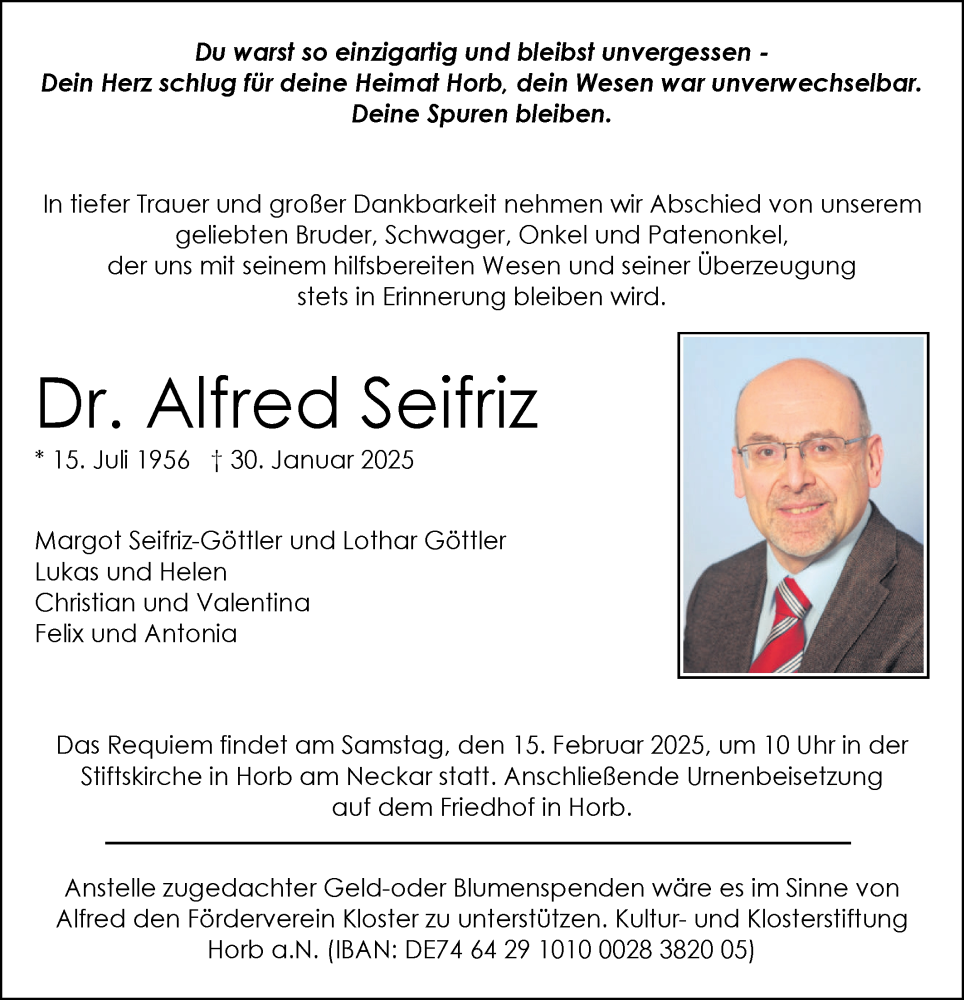Hier finden Sie alle Traueranzeigen aus der Zeitung, die bisher für Alfred Seifriz erschienen sind. Weitere Traueranzeigen, die in der Zeitung erscheinen, werden hier ebenfalls aufgelistet