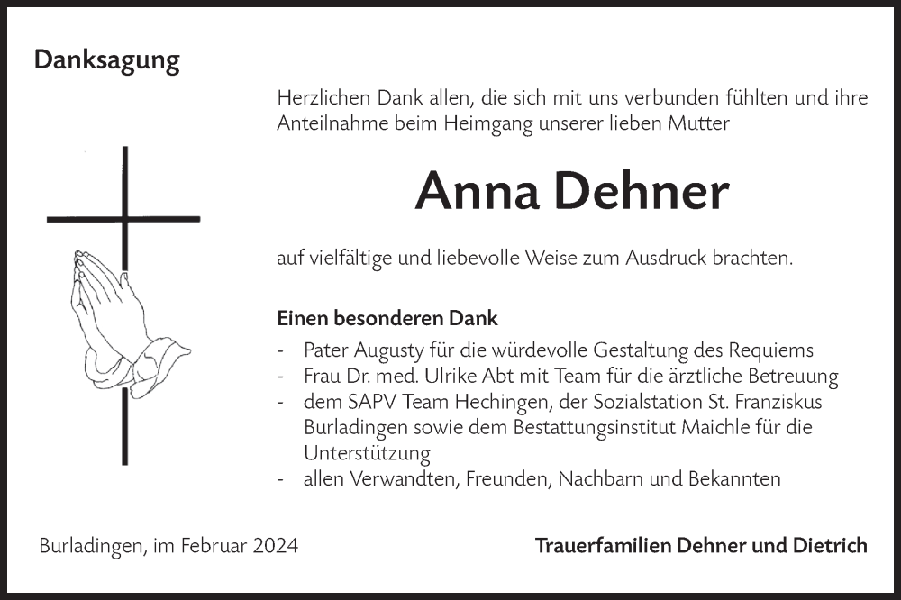 Hier finden Sie alle Traueranzeigen aus der Zeitung, die bisher für Anna Dehner erschienen sind. Weitere Traueranzeigen, die in der Zeitung erscheinen, werden hier ebenfalls aufgelistet