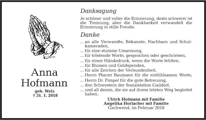 Hier finden Sie alle Traueranzeigen aus der Zeitung, die bisher für Anna Hofmann erschienen sind. Weitere Traueranzeigen, die in der Zeitung erscheinen, werden hier ebenfalls aufgelistet
