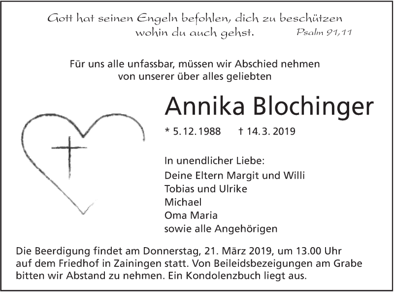 Hier finden Sie alle Traueranzeigen aus der Zeitung, die bisher für Annika Blochinger erschienen sind. Weitere Traueranzeigen, die in der Zeitung erscheinen, werden hier ebenfalls aufgelistet