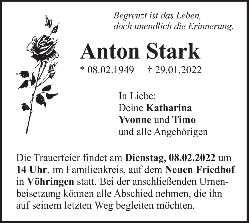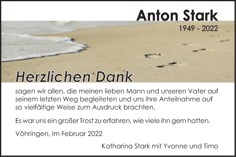Hier finden Sie alle Traueranzeigen aus der Zeitung, die bisher für Anton Stark erschienen sind. Weitere Traueranzeigen, die in der Zeitung erscheinen, werden hier ebenfalls aufgelistet