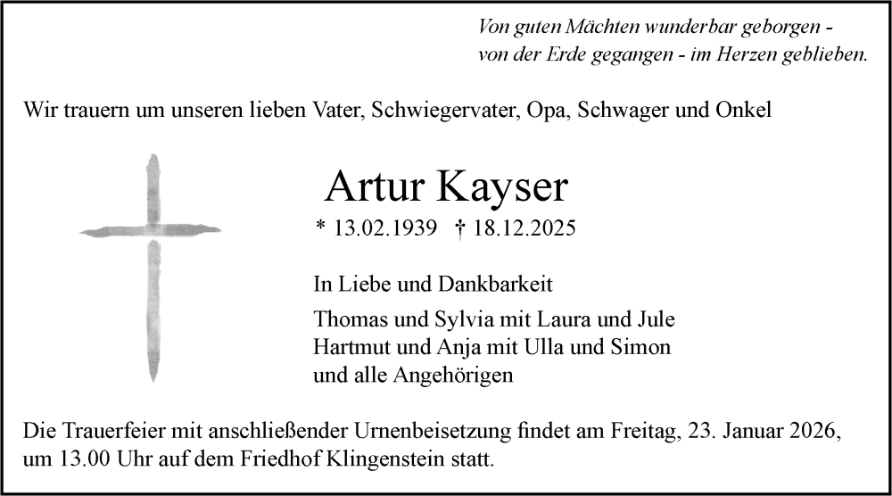 Hier finden Sie alle Traueranzeigen aus der Zeitung, die bisher für Artur Kayser erschienen sind. Weitere Traueranzeigen, die in der Zeitung erscheinen, werden hier ebenfalls aufgelistet
