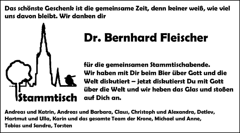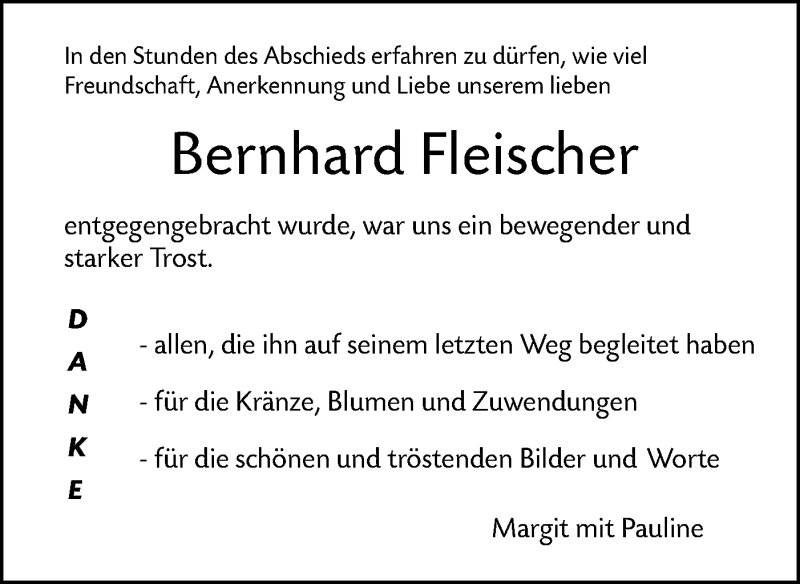 Hier finden Sie alle Traueranzeigen aus der Zeitung, die bisher für Bernhard Fleischer erschienen sind. Weitere Traueranzeigen, die in der Zeitung erscheinen, werden hier ebenfalls aufgelistet
