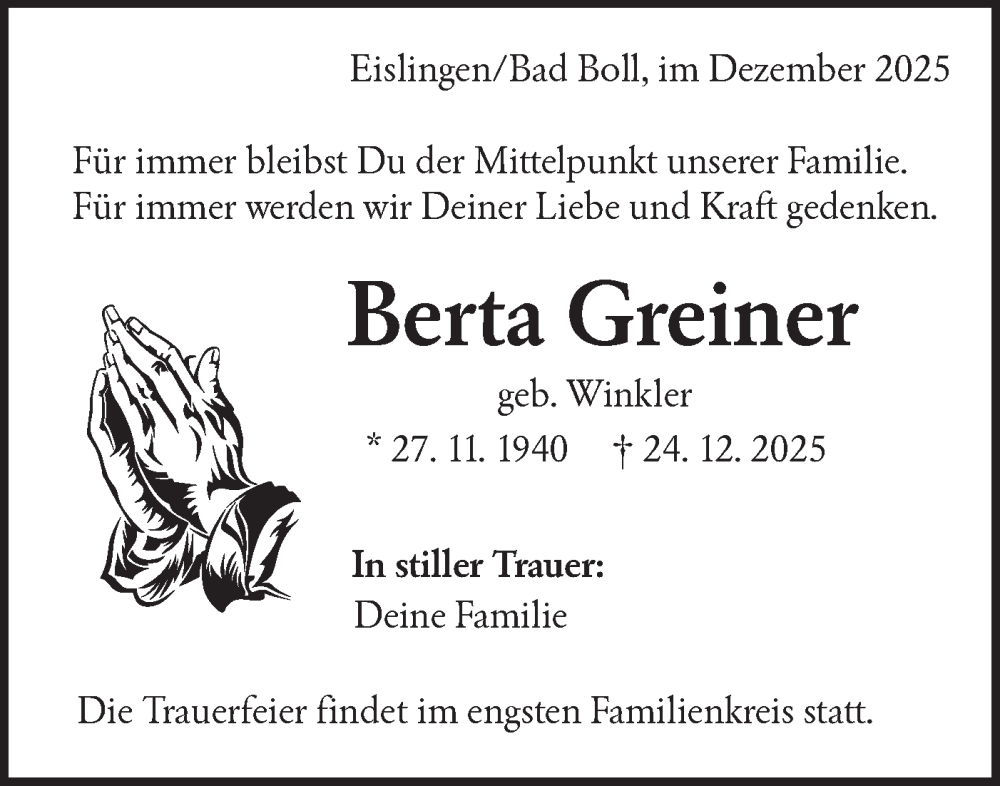 Hier finden Sie alle Traueranzeigen aus der Zeitung, die bisher für Berta Greiner erschienen sind. Weitere Traueranzeigen, die in der Zeitung erscheinen, werden hier ebenfalls aufgelistet