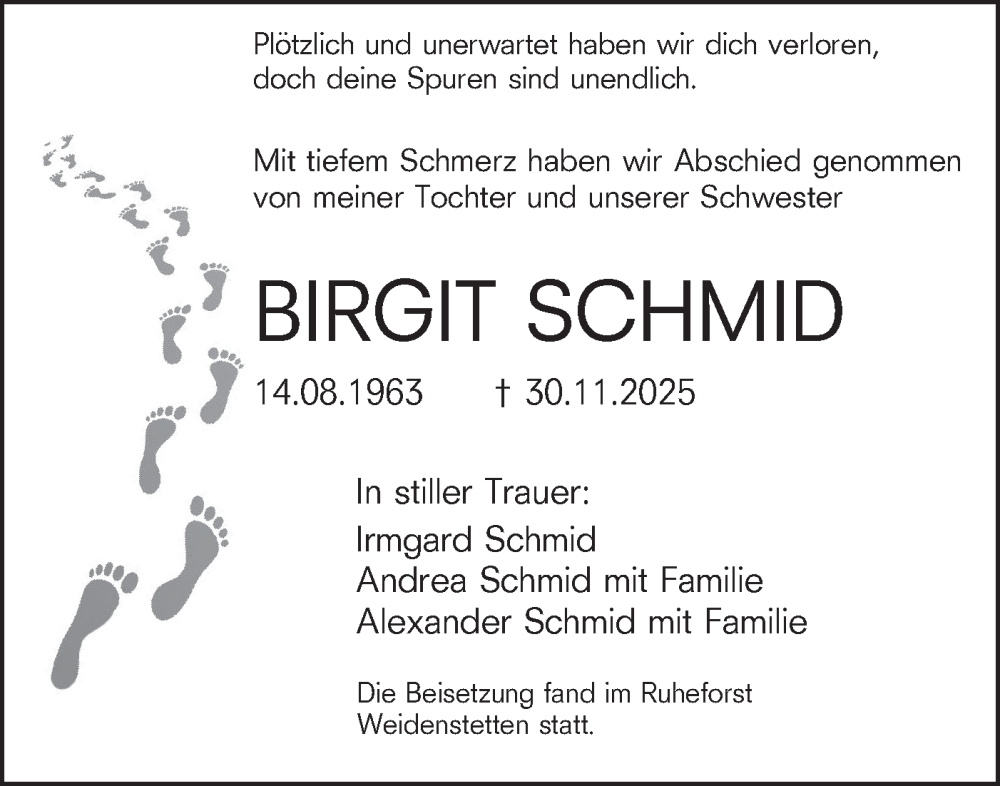 Hier finden Sie alle Traueranzeigen aus der Zeitung, die bisher für Birgit Schmid erschienen sind. Weitere Traueranzeigen, die in der Zeitung erscheinen, werden hier ebenfalls aufgelistet