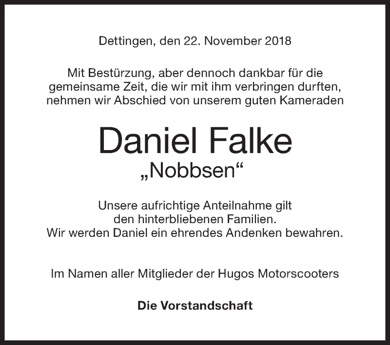 Hier finden Sie alle Traueranzeigen aus der Zeitung, die bisher für Daniel Falke erschienen sind. Weitere Traueranzeigen, die in der Zeitung erscheinen, werden hier ebenfalls aufgelistet