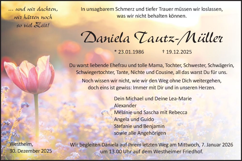 Hier finden Sie alle Traueranzeigen aus der Zeitung, die bisher für Daniela Tautz-Müller erschienen sind. Weitere Traueranzeigen, die in der Zeitung erscheinen, werden hier ebenfalls aufgelistet