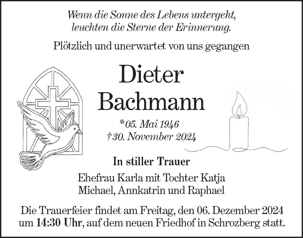 Hier finden Sie alle Traueranzeigen aus der Zeitung, die bisher für Dieter Bachmann erschienen sind. Weitere Traueranzeigen, die in der Zeitung erscheinen, werden hier ebenfalls aufgelistet