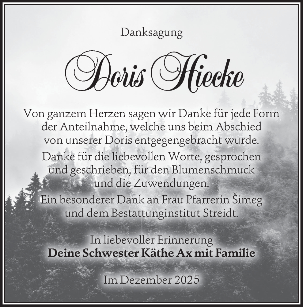 Hier finden Sie alle Traueranzeigen aus der Zeitung, die bisher für Doris Hiecke erschienen sind. Weitere Traueranzeigen, die in der Zeitung erscheinen, werden hier ebenfalls aufgelistet