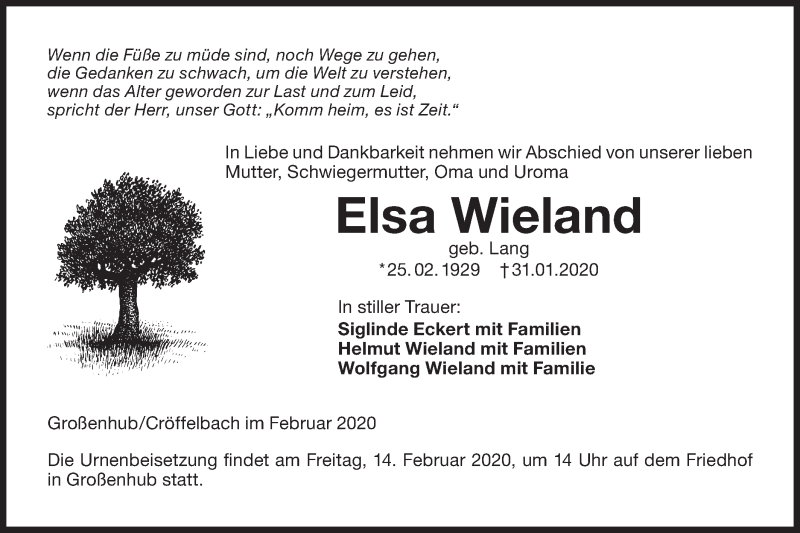 Hier finden Sie alle Traueranzeigen aus der Zeitung, die bisher für Elsa Wieland erschienen sind. Weitere Traueranzeigen, die in der Zeitung erscheinen, werden hier ebenfalls aufgelistet