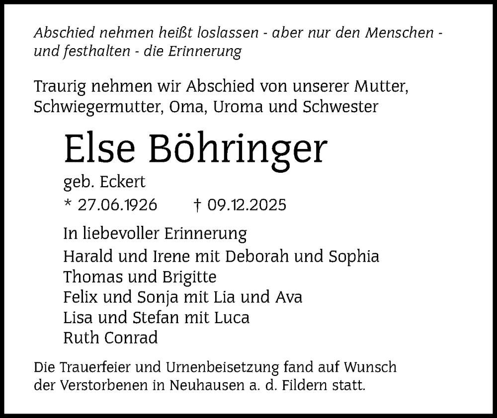Hier finden Sie alle Traueranzeigen aus der Zeitung, die bisher für Else Böhringer erschienen sind. Weitere Traueranzeigen, die in der Zeitung erscheinen, werden hier ebenfalls aufgelistet