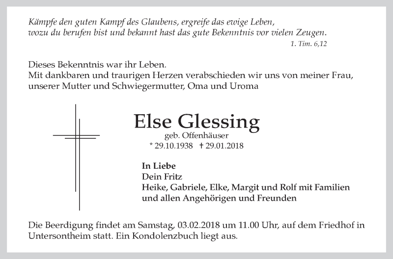 Hier finden Sie alle Traueranzeigen aus der Zeitung, die bisher für Else Glessing erschienen sind. Weitere Traueranzeigen, die in der Zeitung erscheinen, werden hier ebenfalls aufgelistet