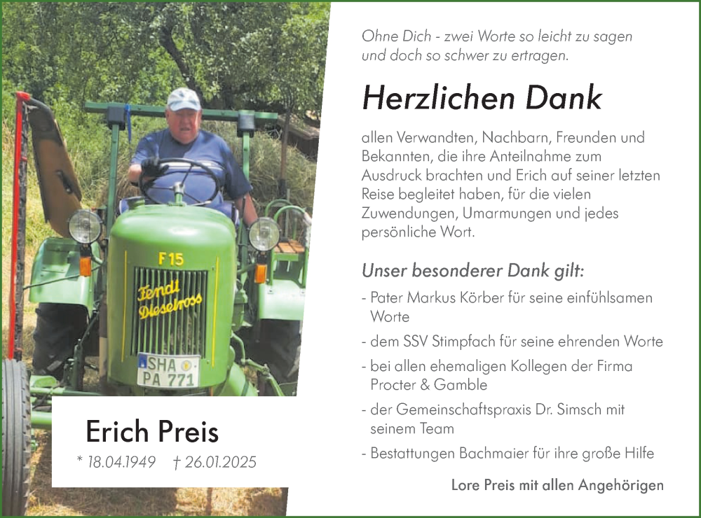 Hier finden Sie alle Traueranzeigen aus der Zeitung, die bisher für Erich Preis erschienen sind. Weitere Traueranzeigen, die in der Zeitung erscheinen, werden hier ebenfalls aufgelistet