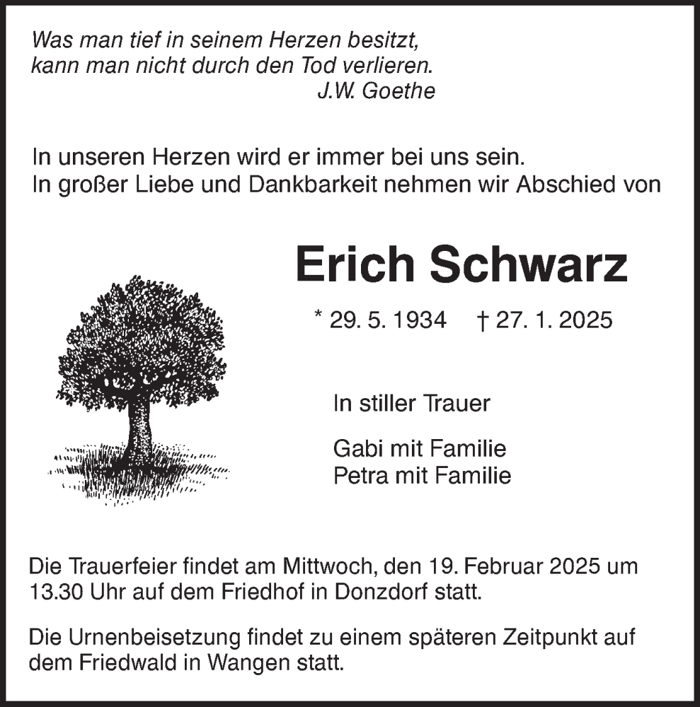 Hier finden Sie alle Traueranzeigen aus der Zeitung, die bisher für Erich Schwarz erschienen sind. Weitere Traueranzeigen, die in der Zeitung erscheinen, werden hier ebenfalls aufgelistet