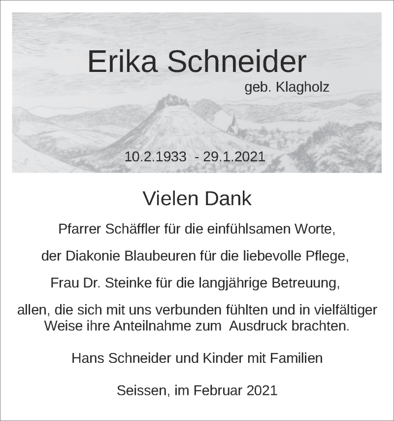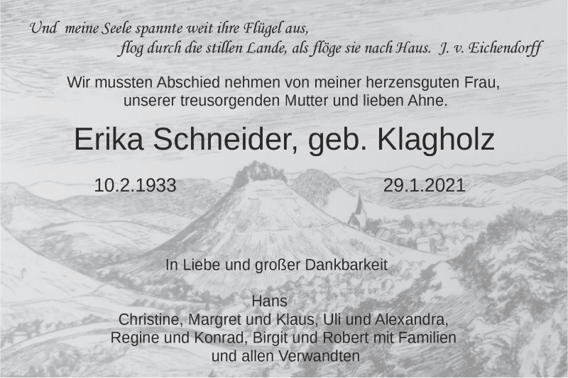 Hier finden Sie alle Traueranzeigen aus der Zeitung, die bisher für Erika Schneider erschienen sind. Weitere Traueranzeigen, die in der Zeitung erscheinen, werden hier ebenfalls aufgelistet
