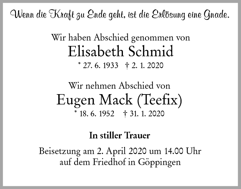 Hier finden Sie alle Traueranzeigen aus der Zeitung, die bisher für Eugen Mack erschienen sind. Weitere Traueranzeigen, die in der Zeitung erscheinen, werden hier ebenfalls aufgelistet