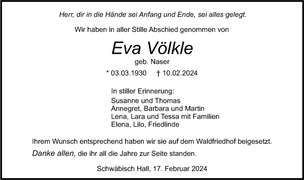 Hier finden Sie alle Traueranzeigen aus der Zeitung, die bisher für Eva Völkle erschienen sind. Weitere Traueranzeigen, die in der Zeitung erscheinen, werden hier ebenfalls aufgelistet