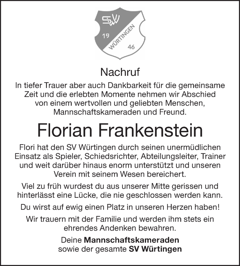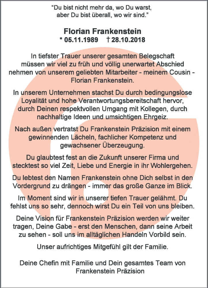 Hier finden Sie alle Traueranzeigen aus der Zeitung, die bisher für Florian Frankenstein erschienen sind. Weitere Traueranzeigen, die in der Zeitung erscheinen, werden hier ebenfalls aufgelistet
