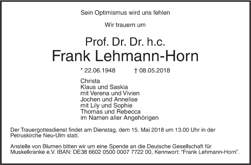 Hier finden Sie alle Traueranzeigen aus der Zeitung, die bisher für Frank Lehmann-Horn erschienen sind. Weitere Traueranzeigen, die in der Zeitung erscheinen, werden hier ebenfalls aufgelistet