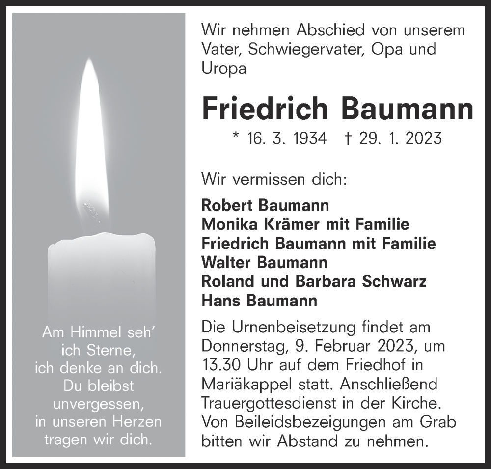 Hier finden Sie alle Traueranzeigen aus der Zeitung, die bisher für Friedrich Baumann erschienen sind. Weitere Traueranzeigen, die in der Zeitung erscheinen, werden hier ebenfalls aufgelistet