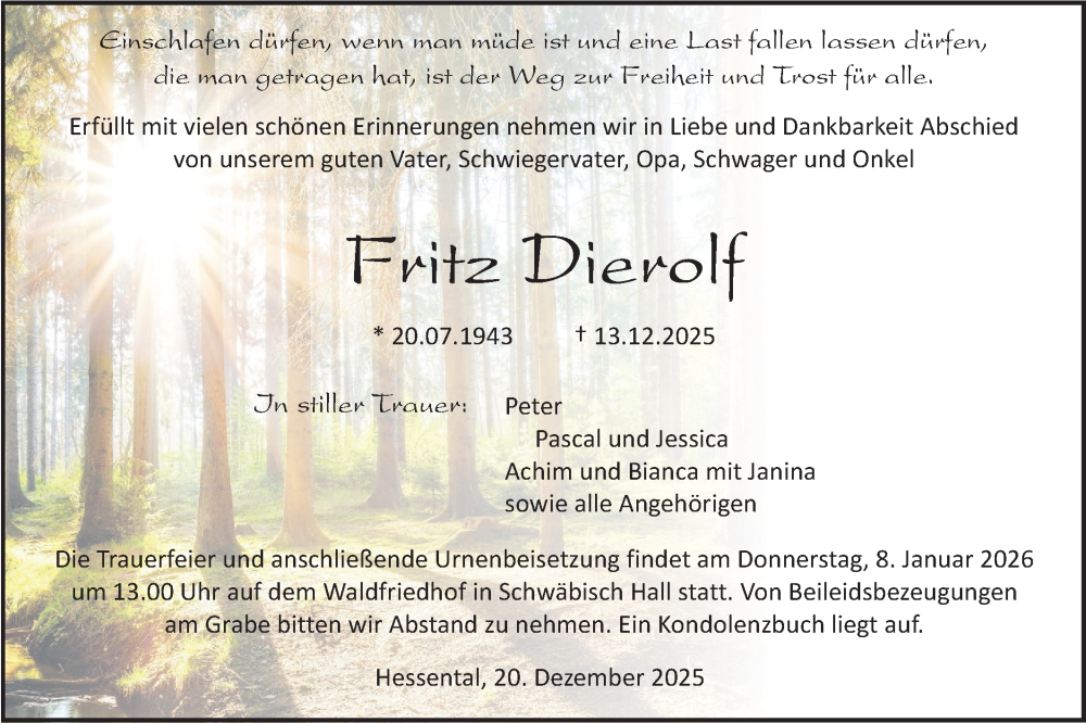 Hier finden Sie alle Traueranzeigen aus der Zeitung, die bisher für Fritz Dierolf erschienen sind. Weitere Traueranzeigen, die in der Zeitung erscheinen, werden hier ebenfalls aufgelistet