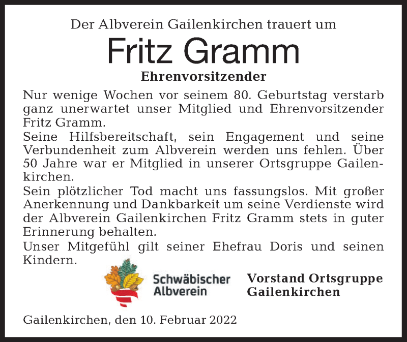 Hier finden Sie alle Traueranzeigen aus der Zeitung, die bisher für Fritz Gramm erschienen sind. Weitere Traueranzeigen, die in der Zeitung erscheinen, werden hier ebenfalls aufgelistet