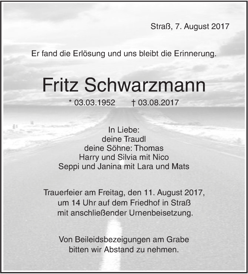 Hier finden Sie alle Traueranzeigen aus der Zeitung, die bisher für Fritz Schwarzmann erschienen sind. Weitere Traueranzeigen, die in der Zeitung erscheinen, werden hier ebenfalls aufgelistet