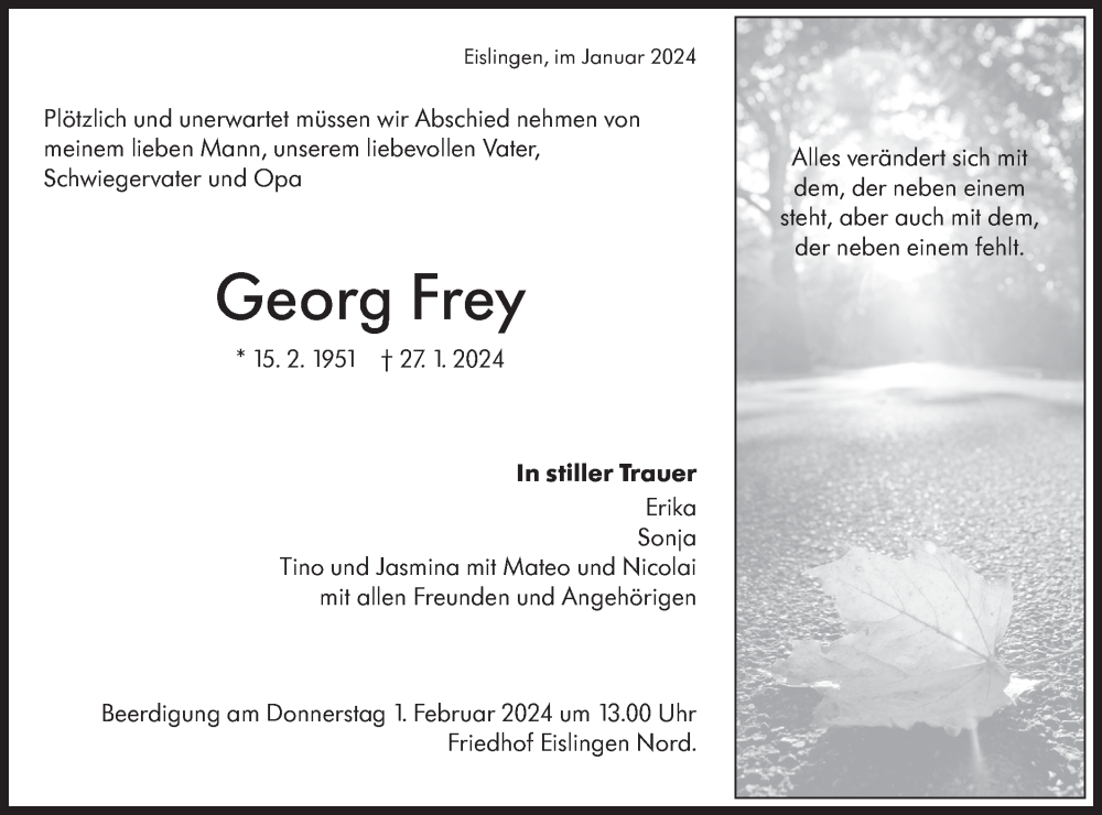 Hier finden Sie alle Traueranzeigen aus der Zeitung, die bisher für Georg Frey erschienen sind. Weitere Traueranzeigen, die in der Zeitung erscheinen, werden hier ebenfalls aufgelistet