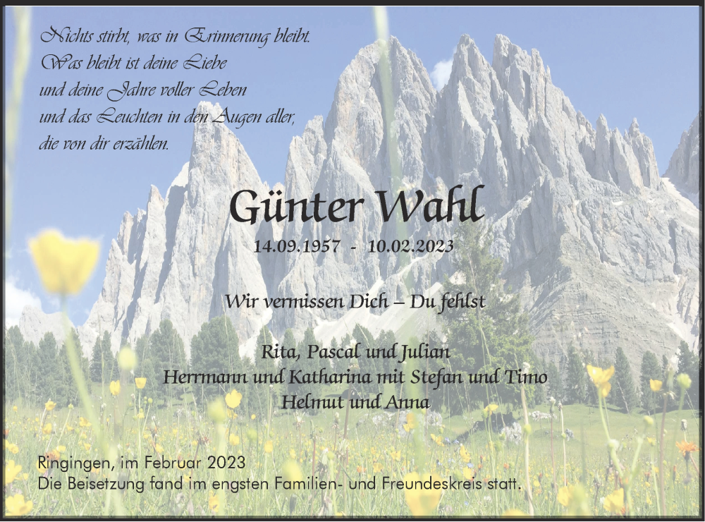 Hier finden Sie alle Traueranzeigen aus der Zeitung, die bisher für Günter Wahl erschienen sind. Weitere Traueranzeigen, die in der Zeitung erscheinen, werden hier ebenfalls aufgelistet