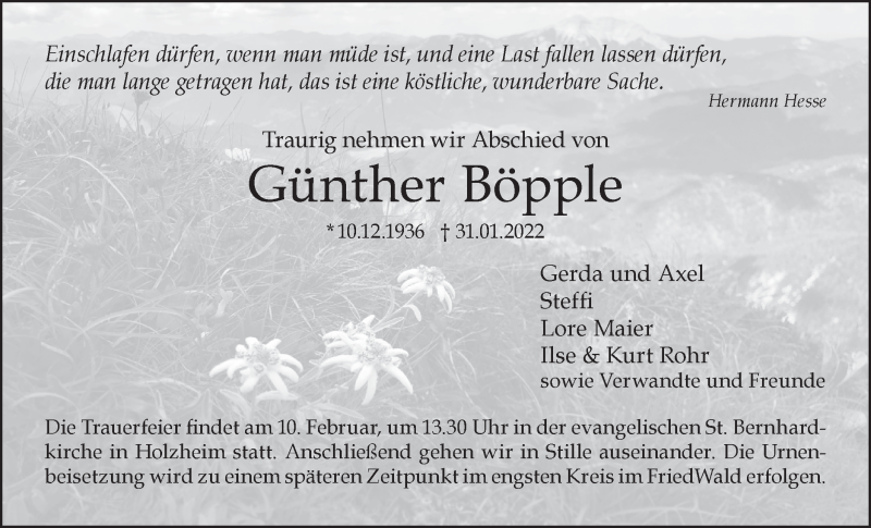 Hier finden Sie alle Traueranzeigen aus der Zeitung, die bisher für Günther Böpple erschienen sind. Weitere Traueranzeigen, die in der Zeitung erscheinen, werden hier ebenfalls aufgelistet