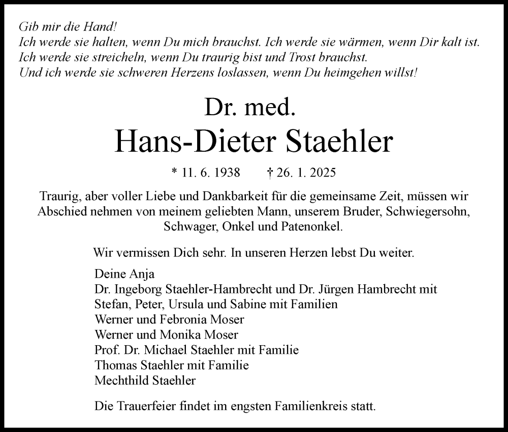 Hier finden Sie alle Traueranzeigen aus der Zeitung, die bisher für Hans-Dieter Staehler erschienen sind. Weitere Traueranzeigen, die in der Zeitung erscheinen, werden hier ebenfalls aufgelistet
