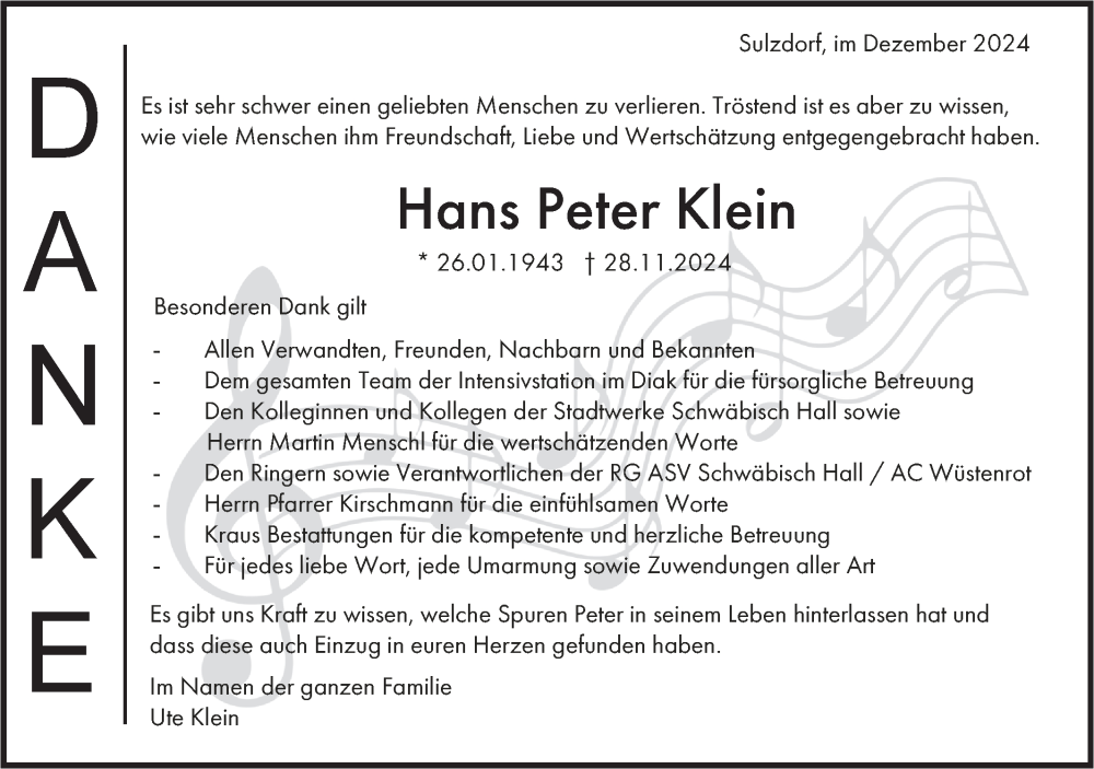 Hier finden Sie alle Traueranzeigen aus der Zeitung, die bisher für Hans Peter Klein erschienen sind. Weitere Traueranzeigen, die in der Zeitung erscheinen, werden hier ebenfalls aufgelistet