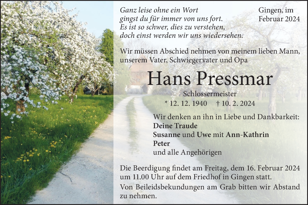 Hier finden Sie alle Traueranzeigen aus der Zeitung, die bisher für Hans Pressmar erschienen sind. Weitere Traueranzeigen, die in der Zeitung erscheinen, werden hier ebenfalls aufgelistet