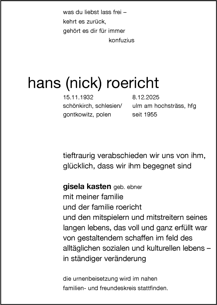 Hier finden Sie alle Traueranzeigen aus der Zeitung, die bisher für Hans Roericht erschienen sind. Weitere Traueranzeigen, die in der Zeitung erscheinen, werden hier ebenfalls aufgelistet