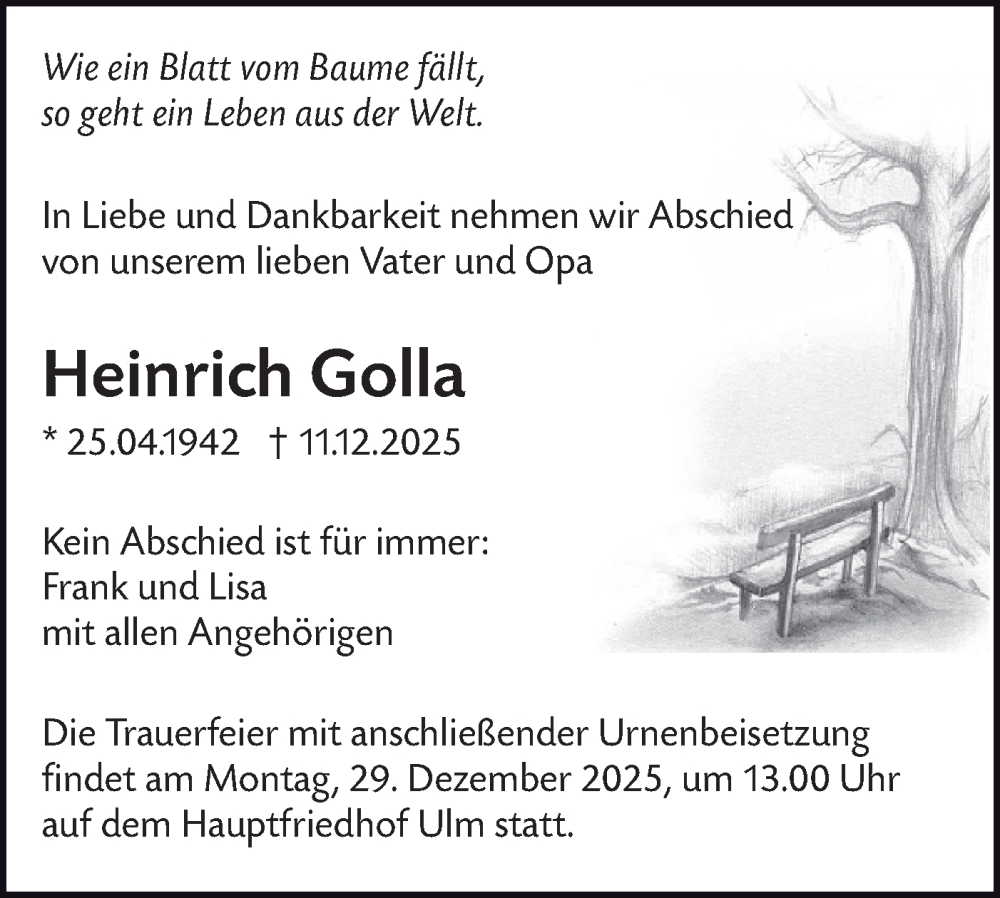 Hier finden Sie alle Traueranzeigen aus der Zeitung, die bisher für Heinrich Golla erschienen sind. Weitere Traueranzeigen, die in der Zeitung erscheinen, werden hier ebenfalls aufgelistet