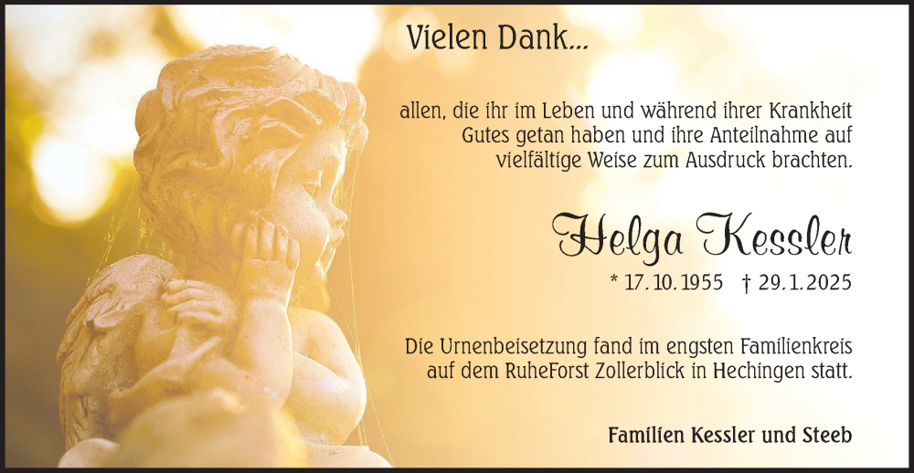 Hier finden Sie alle Traueranzeigen aus der Zeitung, die bisher für Helga Kessler erschienen sind. Weitere Traueranzeigen, die in der Zeitung erscheinen, werden hier ebenfalls aufgelistet