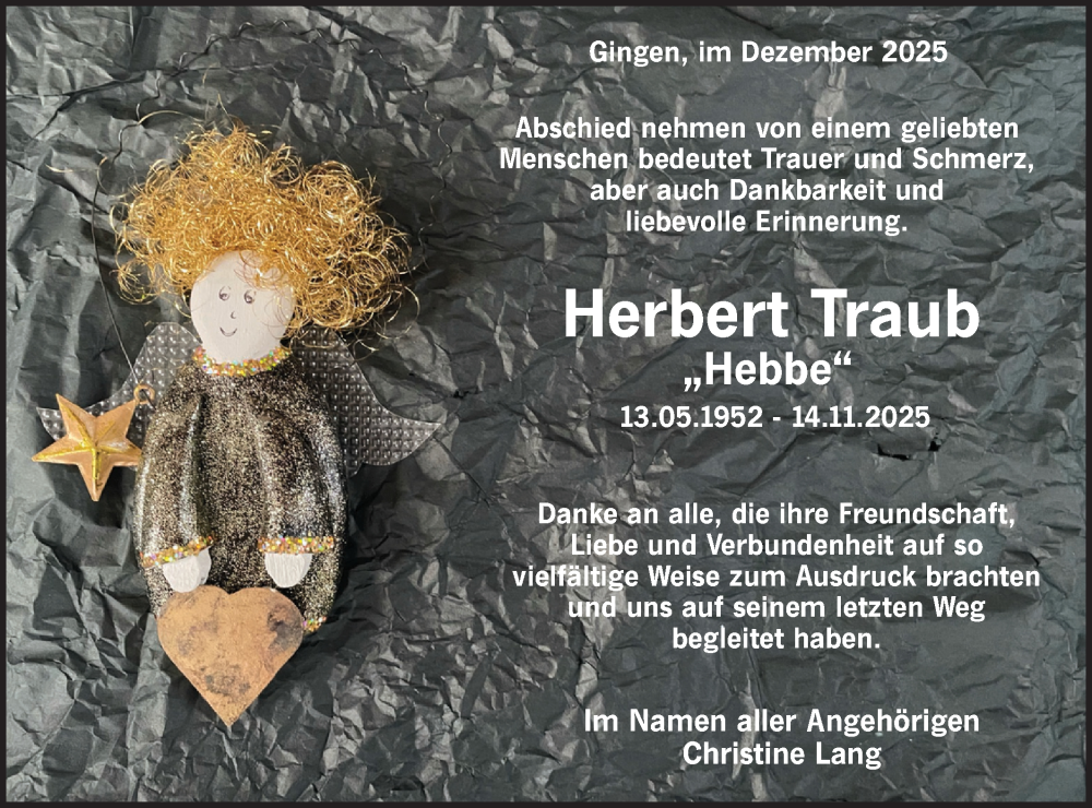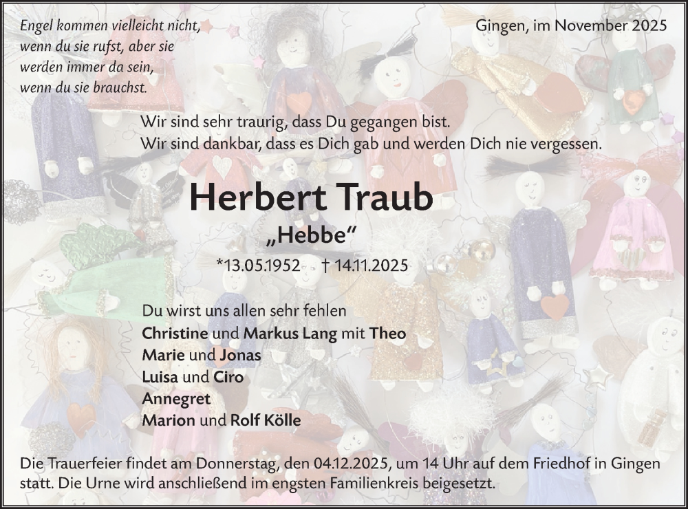 Hier finden Sie alle Traueranzeigen aus der Zeitung, die bisher für Herbert Traub erschienen sind. Weitere Traueranzeigen, die in der Zeitung erscheinen, werden hier ebenfalls aufgelistet