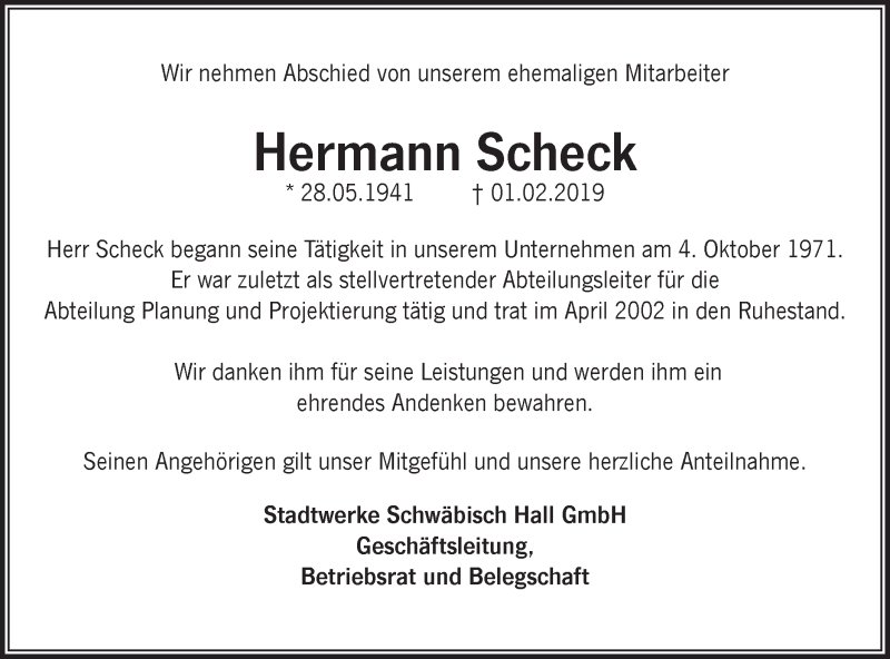 Hier finden Sie alle Traueranzeigen aus der Zeitung, die bisher für Hermann Scheck erschienen sind. Weitere Traueranzeigen, die in der Zeitung erscheinen, werden hier ebenfalls aufgelistet