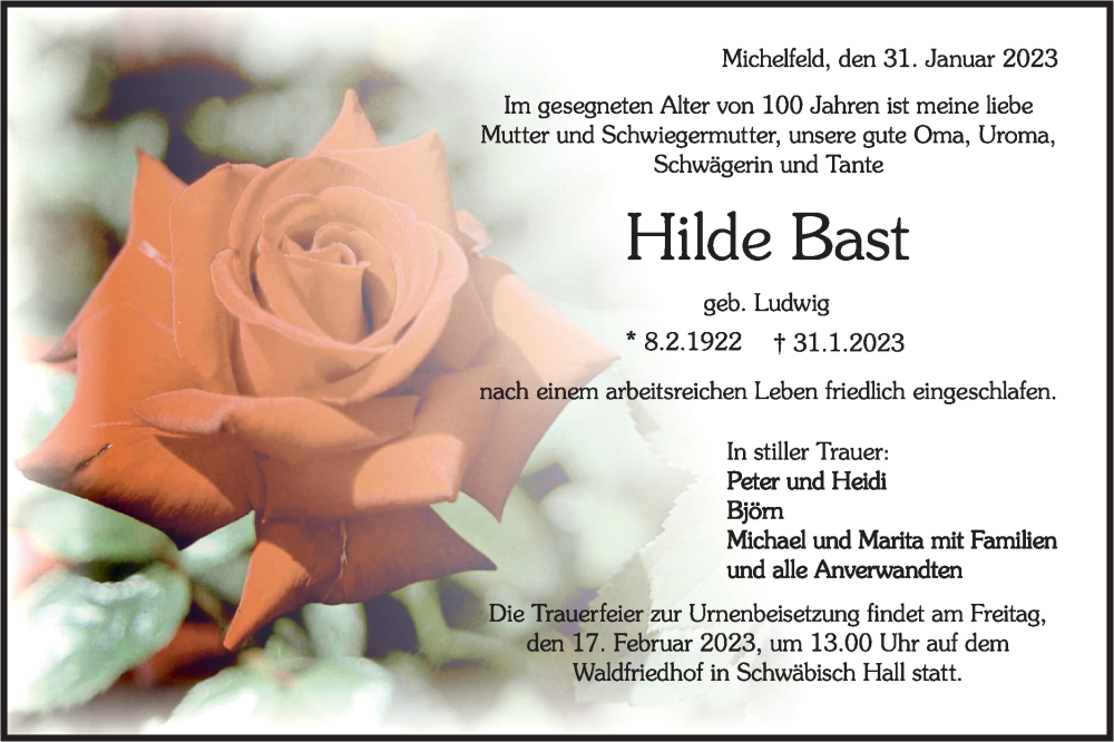 Hier finden Sie alle Traueranzeigen aus der Zeitung, die bisher für Hilde Bast erschienen sind. Weitere Traueranzeigen, die in der Zeitung erscheinen, werden hier ebenfalls aufgelistet