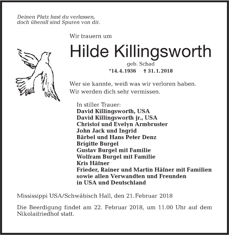 Hier finden Sie alle Traueranzeigen aus der Zeitung, die bisher für Hilde Killingsworth erschienen sind. Weitere Traueranzeigen, die in der Zeitung erscheinen, werden hier ebenfalls aufgelistet