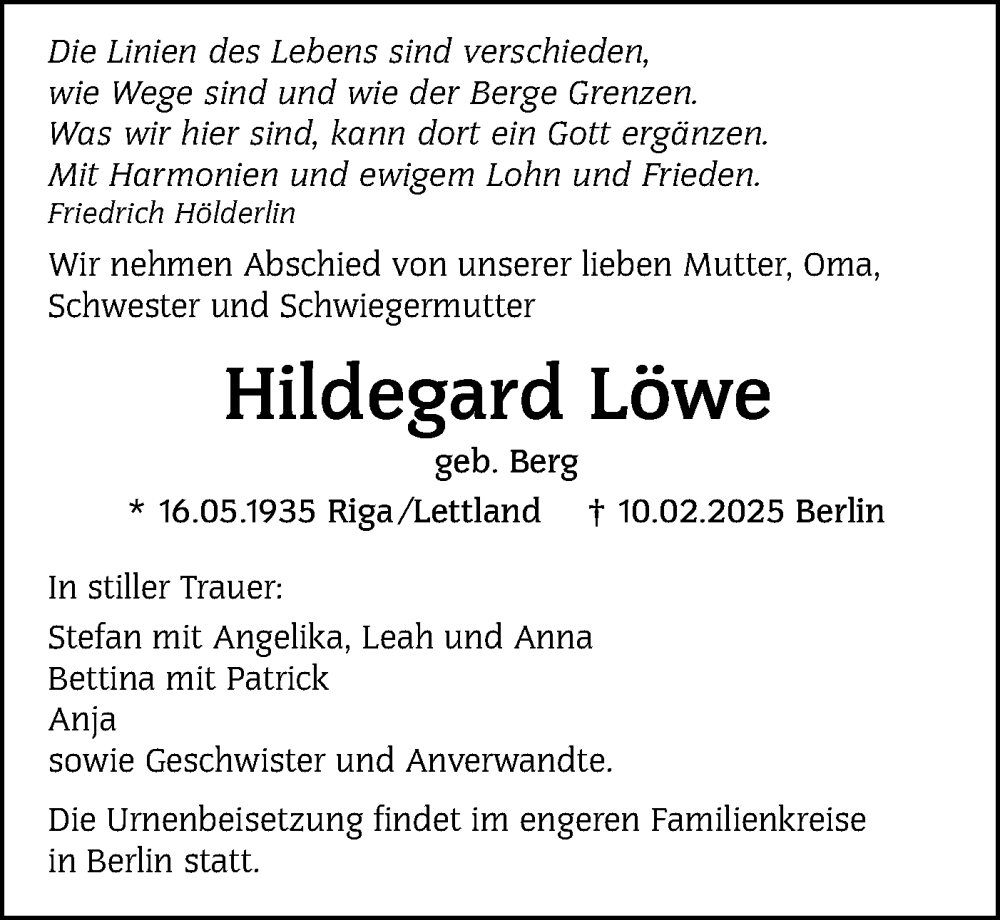 Hier finden Sie alle Traueranzeigen aus der Zeitung, die bisher für Hildegard Löwe erschienen sind. Weitere Traueranzeigen, die in der Zeitung erscheinen, werden hier ebenfalls aufgelistet