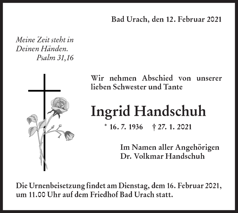 Hier finden Sie alle Traueranzeigen aus der Zeitung, die bisher für Ingrid Handschuh erschienen sind. Weitere Traueranzeigen, die in der Zeitung erscheinen, werden hier ebenfalls aufgelistet
