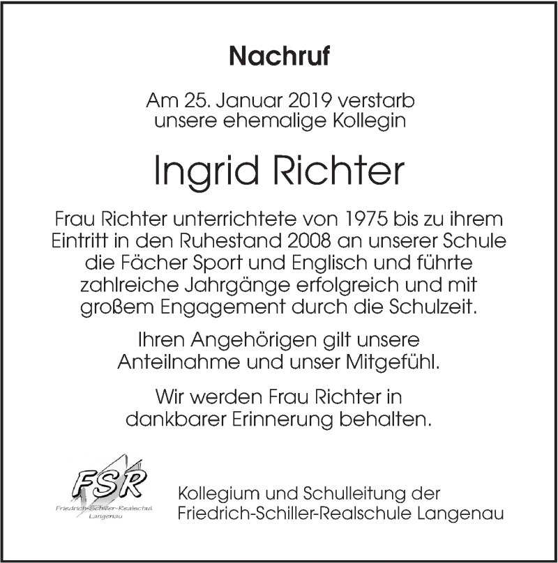 Hier finden Sie alle Traueranzeigen aus der Zeitung, die bisher für Ingrid Richter erschienen sind. Weitere Traueranzeigen, die in der Zeitung erscheinen, werden hier ebenfalls aufgelistet