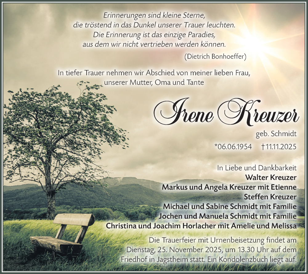 Hier finden Sie alle Traueranzeigen aus der Zeitung, die bisher für Irene Kreuzer erschienen sind. Weitere Traueranzeigen, die in der Zeitung erscheinen, werden hier ebenfalls aufgelistet