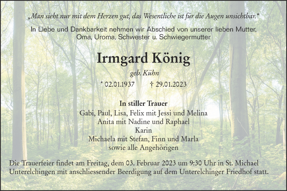 Hier finden Sie alle Traueranzeigen aus der Zeitung, die bisher für Irmgard König erschienen sind. Weitere Traueranzeigen, die in der Zeitung erscheinen, werden hier ebenfalls aufgelistet