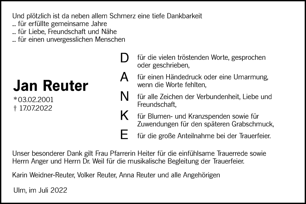 Hier finden Sie alle Traueranzeigen aus der Zeitung, die bisher für Jan Reuter erschienen sind. Weitere Traueranzeigen, die in der Zeitung erscheinen, werden hier ebenfalls aufgelistet
