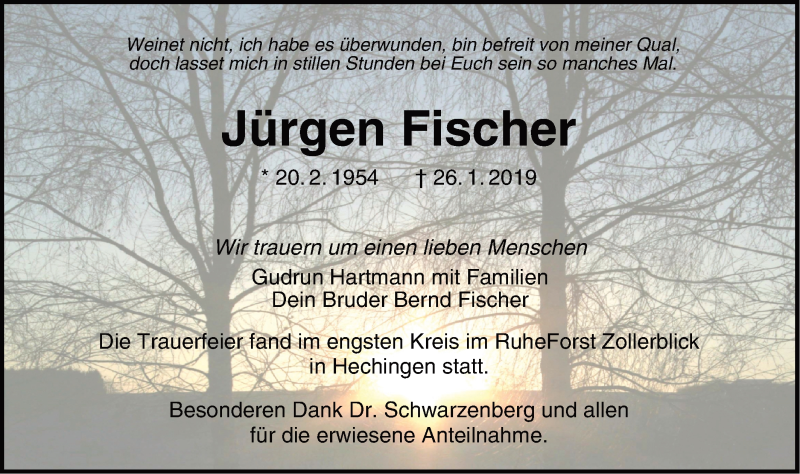 Hier finden Sie alle Traueranzeigen aus der Zeitung, die bisher für Jürgen Fischer erschienen sind. Weitere Traueranzeigen, die in der Zeitung erscheinen, werden hier ebenfalls aufgelistet