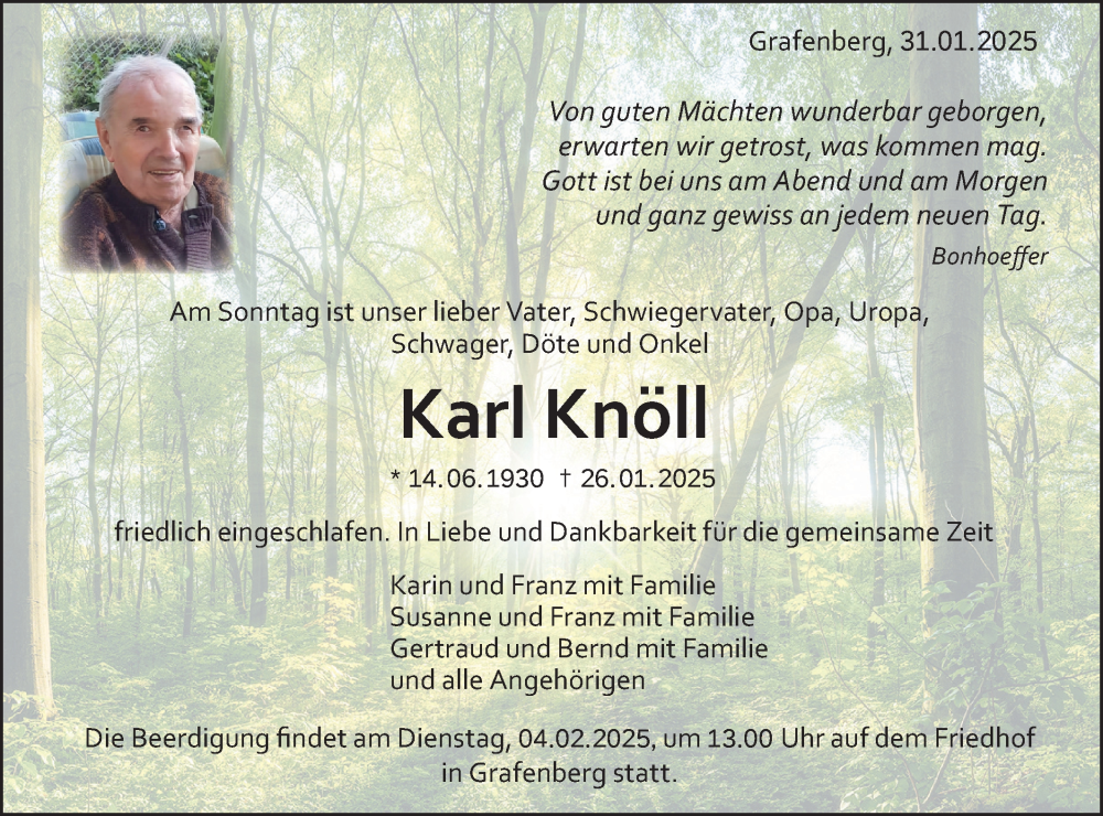 Hier finden Sie alle Traueranzeigen aus der Zeitung, die bisher für Karl Knöll erschienen sind. Weitere Traueranzeigen, die in der Zeitung erscheinen, werden hier ebenfalls aufgelistet