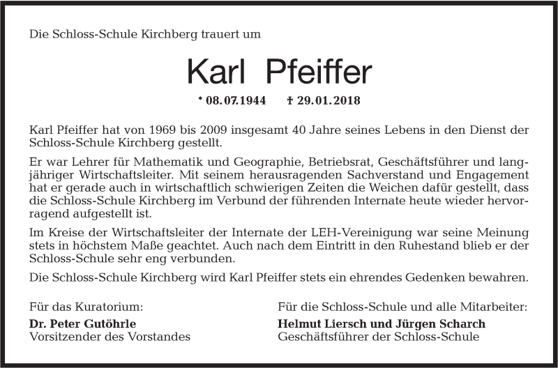 Hier finden Sie alle Traueranzeigen aus der Zeitung, die bisher für Karl Pfeiffer erschienen sind. Weitere Traueranzeigen, die in der Zeitung erscheinen, werden hier ebenfalls aufgelistet